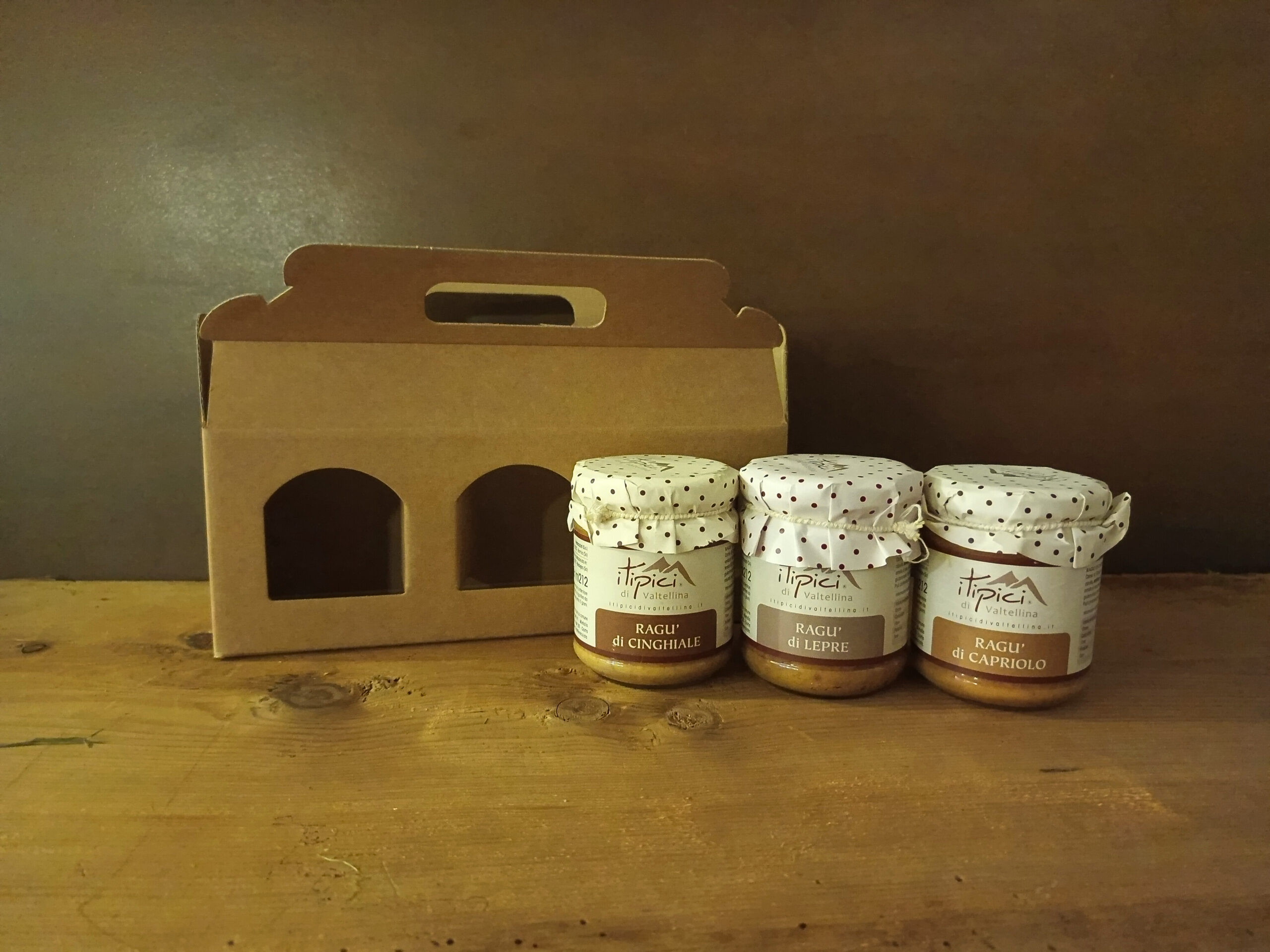 Una pratica e comoda confezione da tre vasetti di sughi di vari gusti di selvaggina, che riportano ai sapori autentici della Valtellina. Ideali per condire pasta, gnocchi o ravioli.